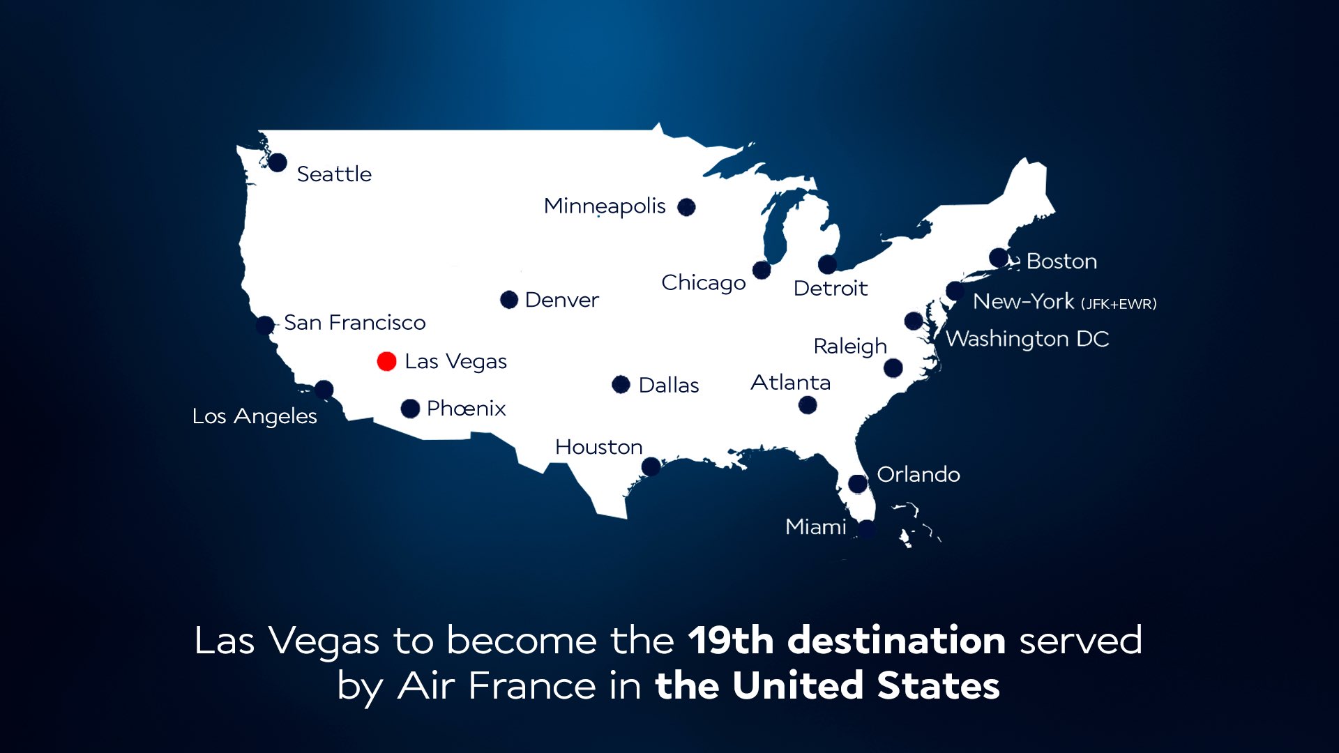 Starting on 15 April, the French flag carrier has flown a direct service between Paris-Charles de Gaulle and Las Vegas, Nevada, operated three times a week on Mondays, Wednesdays, and Saturdays. Flights are operated with Airbus A350-900 aircraft, departing Paris-Charles de Gaulle at 1:40 pm, and arriving in Las Vegas at 3:35 pm. Coming the other way, the service takes off from Las Vegas at 5:50 pm, touching down at Paris-Charles de Gaulle at 1:05 pm the following day.