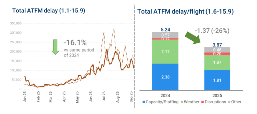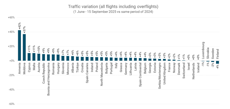 The European Aviation Trends Report from air traffic coordinator EUROCONTROL shows overall year-on-year growth for the period from 1 June to 15 September 2025 of 3.3% and a reduction in en-route delays per flight of 31%, with arrival punctuality up 6.4 percentage points to 71.6% for the period.