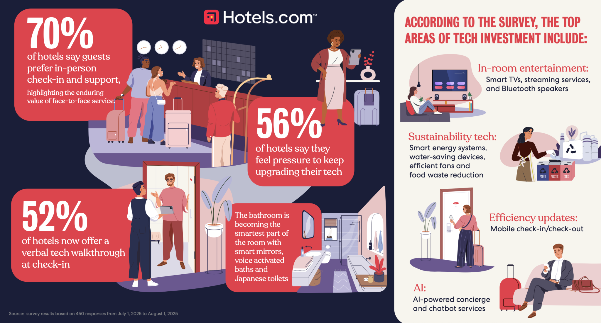 Contact with a human is especially important during check-in and other front-of-house situations, according to responses collated in the 2025 Hotel Room Innsights report. However, this valuable contact time is being taken up, in 52% of hotels, with explainers of in-house tech systems, such as smart lighting and air-con in rooms, smart TV connections, streaming services, and Bluetooth speakers, mobile check-in/out, AI-powered concierge and chatbox services, smart mirrors, motion-triggered taps, digital water temperature controls, and voice activated bathtubs.