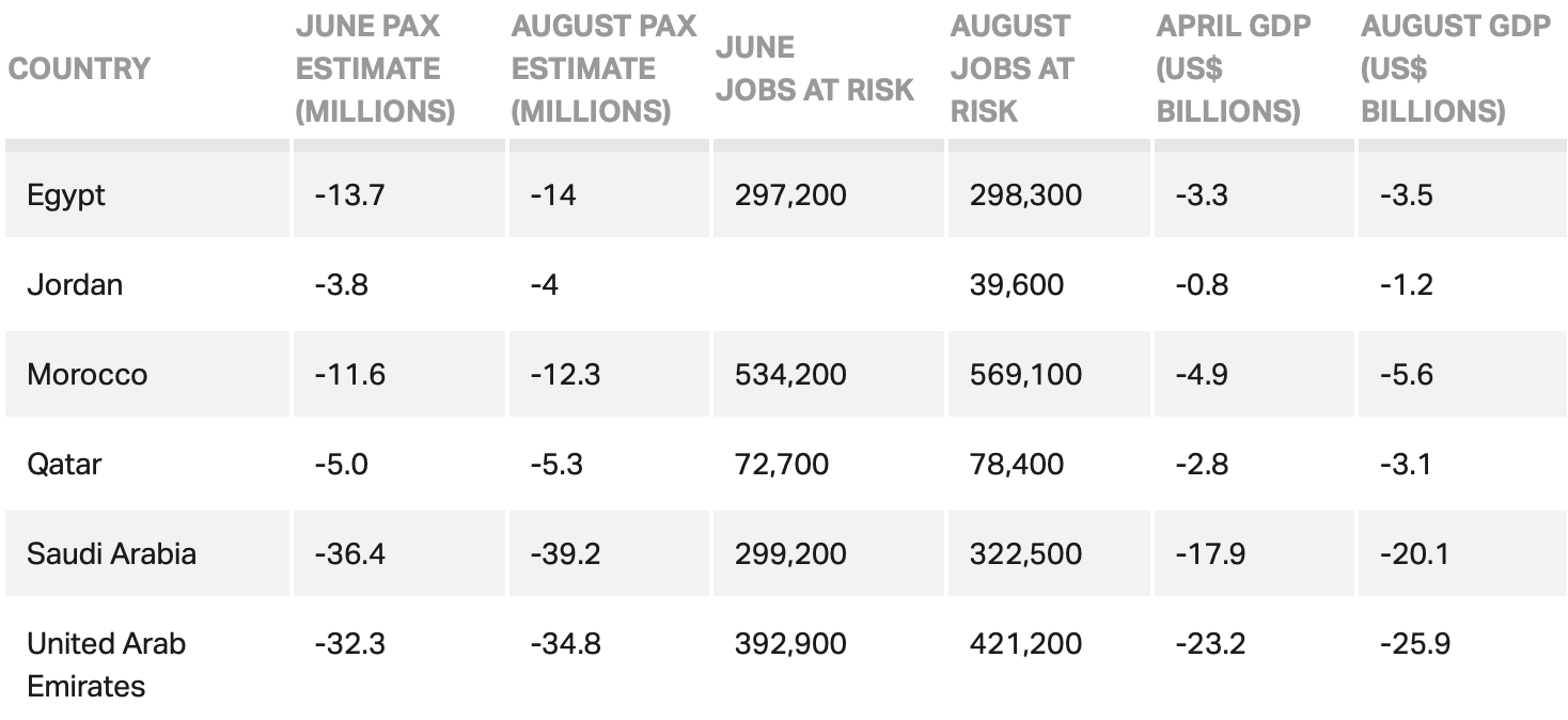 The latest assessment on the Middle East from IATA Economics shows that the outlook at the national level has worsened for major aviation markets since June. For instance, the number of jobs at risk, the passenger numbers, and GDP impacts all have declined: